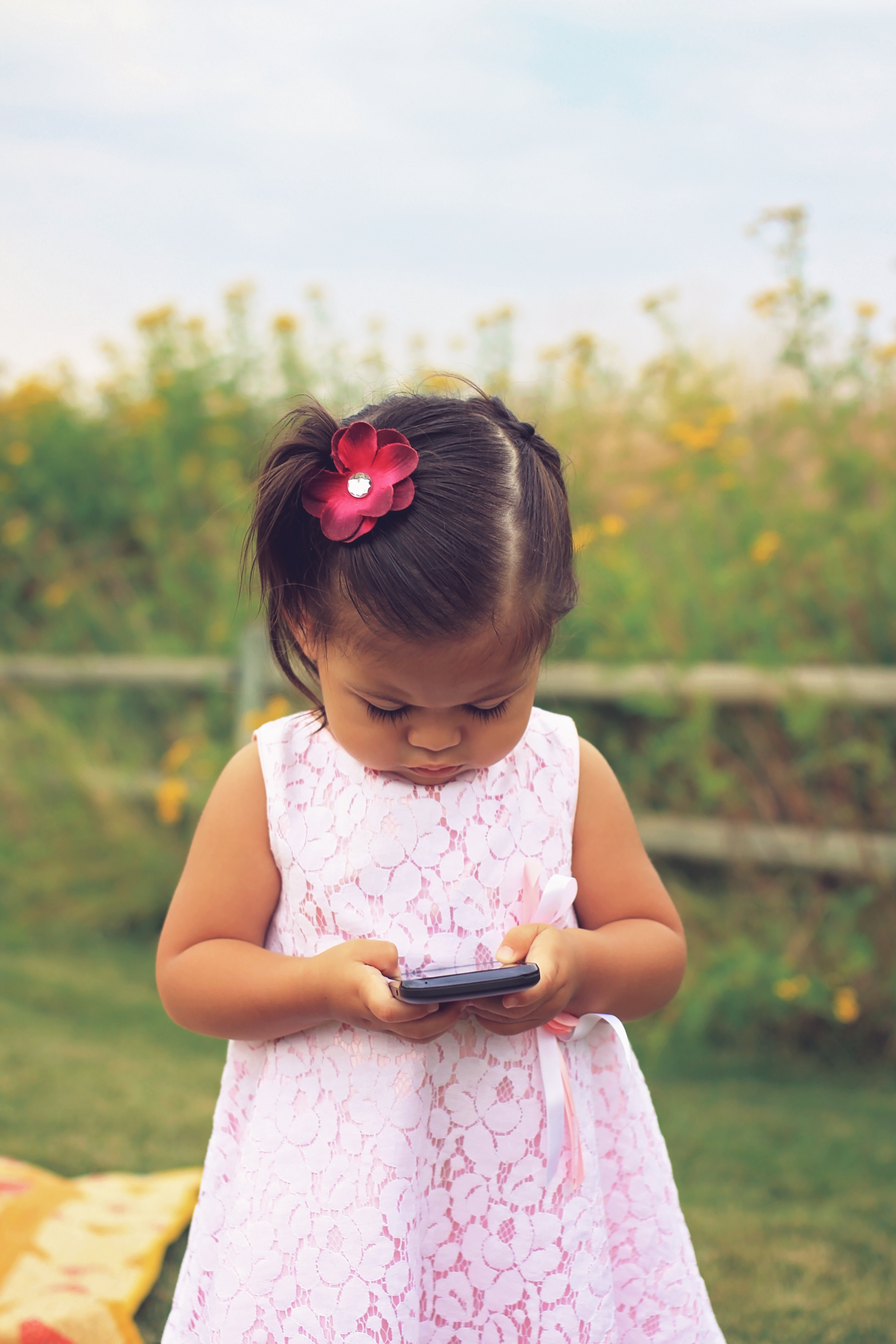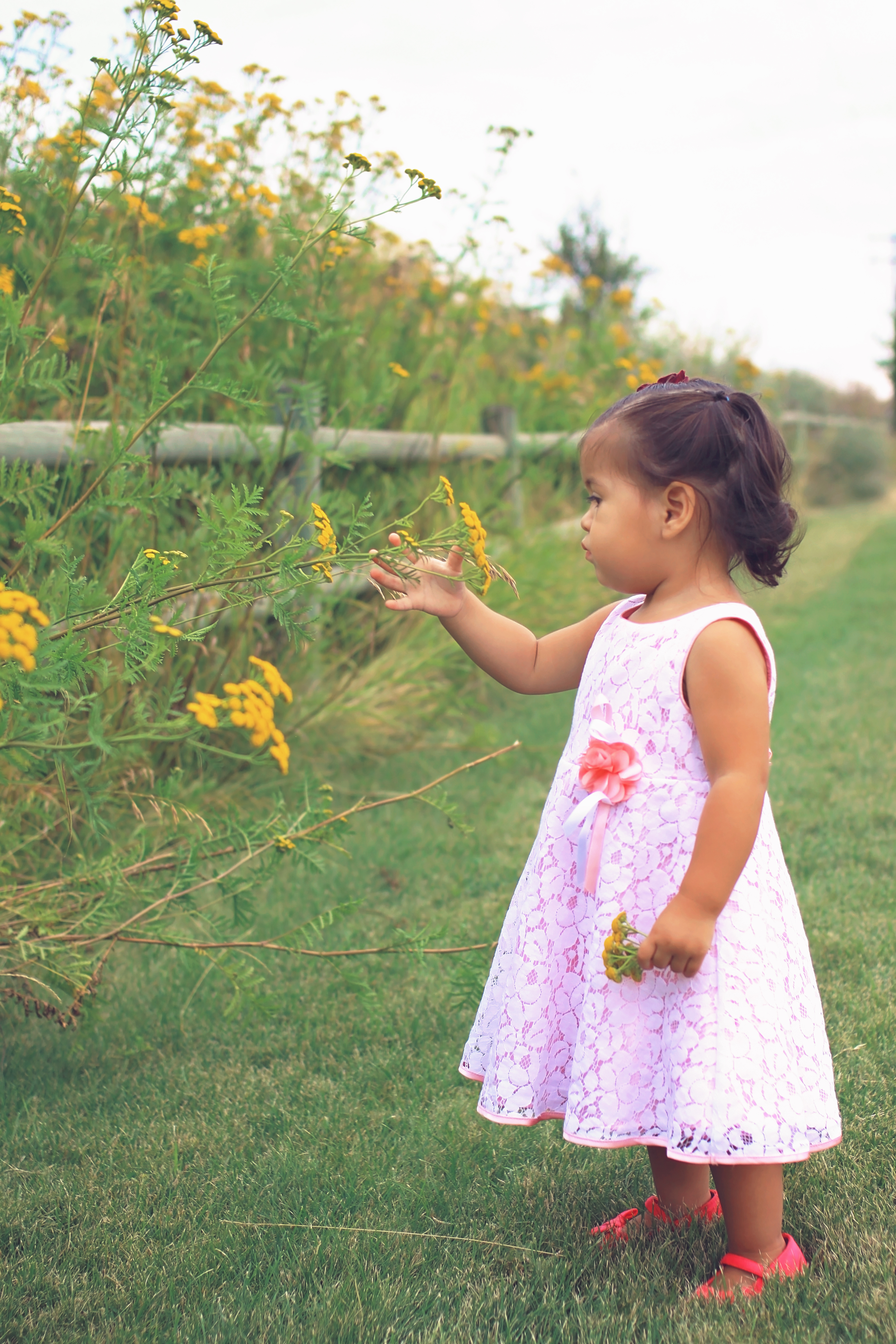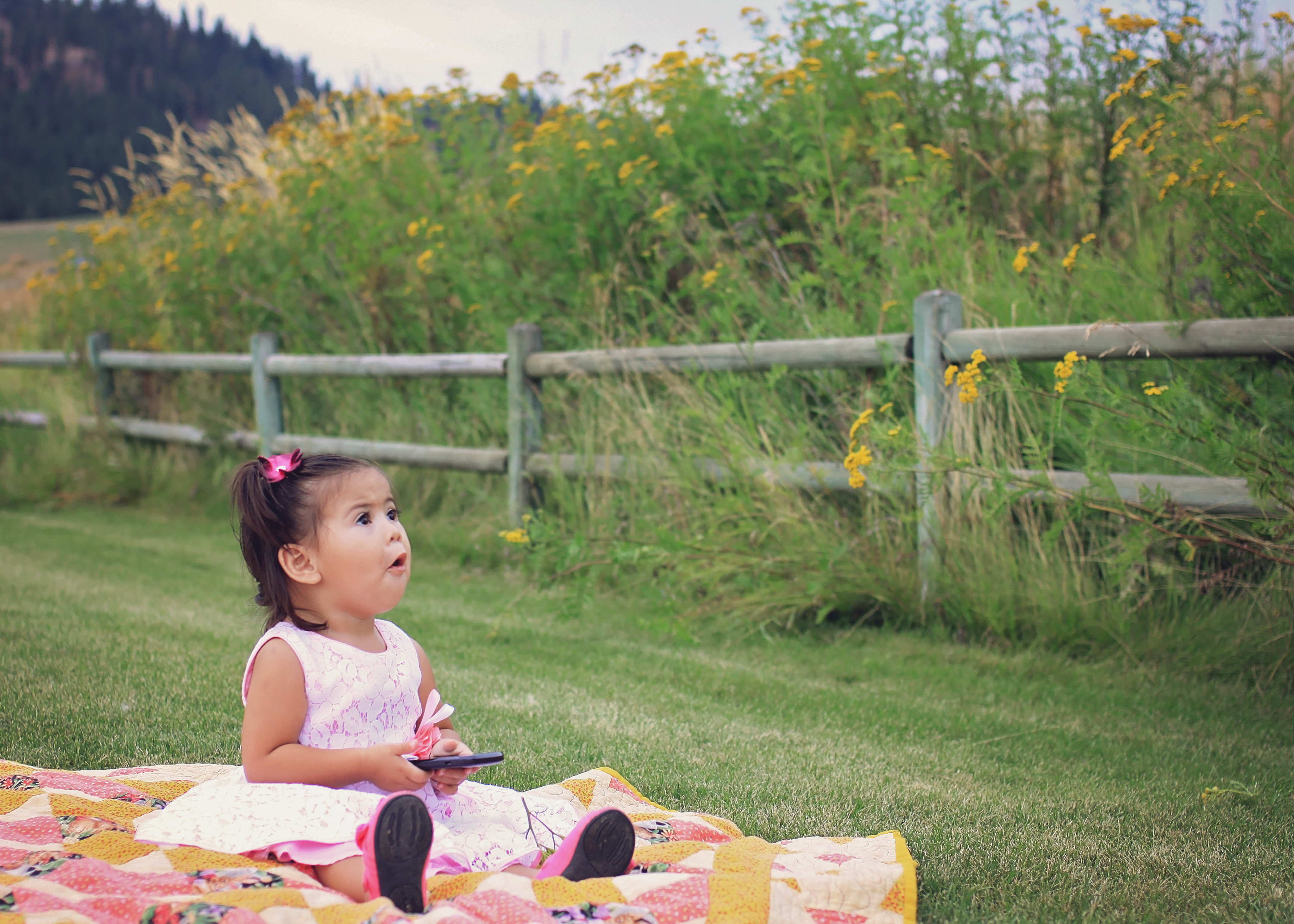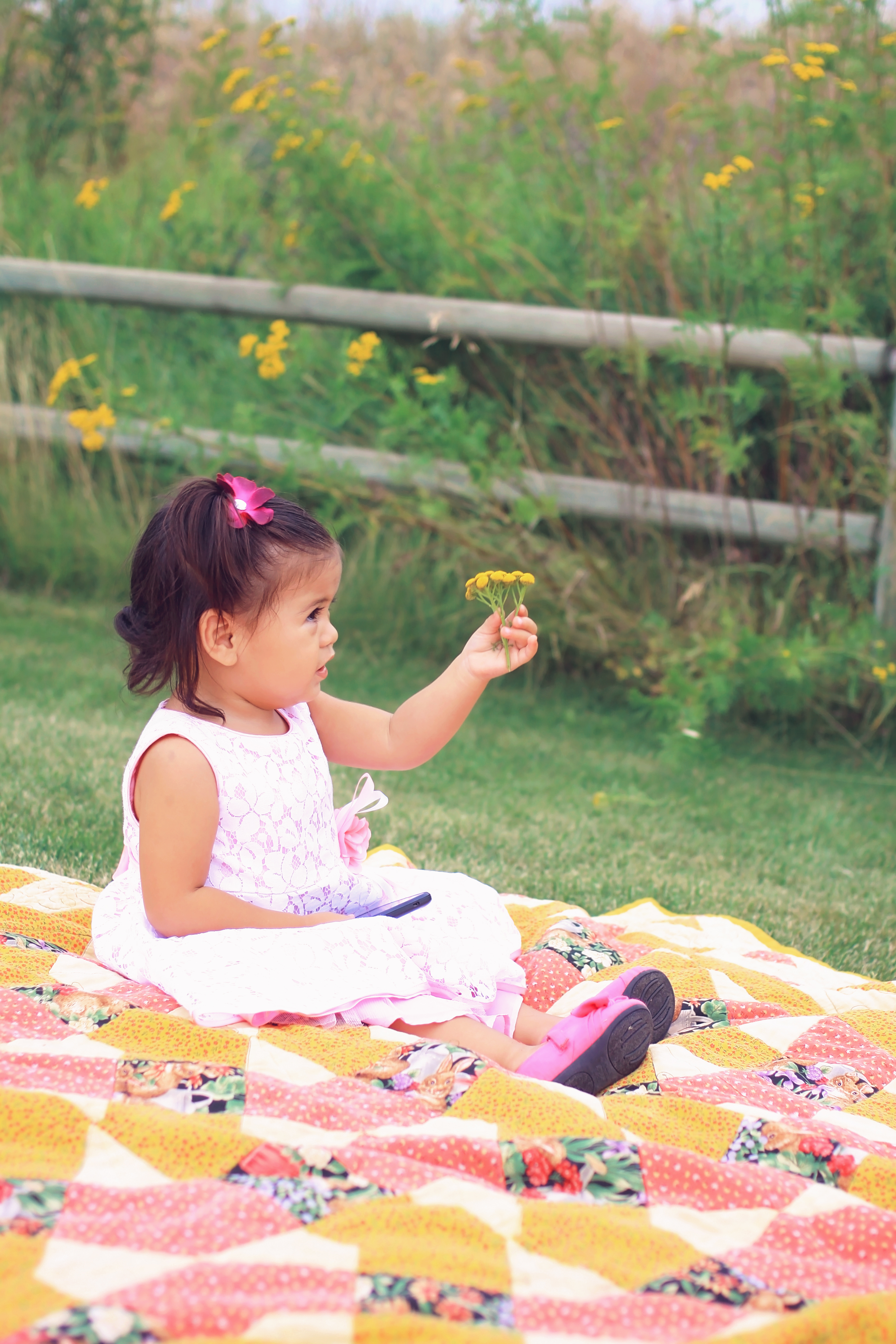 Glorious Summer days are the best ones for an outdoor session. Little Miss Esmerelda was up from Salt Lake City, UT, for a visit, so we took advantage of a gorgeous day and went for a drive. We drove around Chewelah, Washington, looking for just the right spot to hop out and take pictures. Before we could find the perfect spot, Esmerelda decided it was nap time. Ut oh, babies aren’t very good at waking up happy from short naps. The session started out a little on the grumpy side, but once we went to the creek she became more lively. This session actually taught me something of great importance, and that is to look at the flower you are sniffing before sniffing it. I managed to snort a bug up my nose trying to demonstrate how to smell the flowers. EEEk I don’t like bugs and I especially don’t like them up my nose! I’m not sure there is a polite way to blow a bug back out of your nose. I’m pretty sure I didn’t care at that point. Once I was rid of the bug, it was back to picture taking time. This time with no flower sniffing. Any way enough about my my nose, look at these adorable images of little miss Esmerelda.